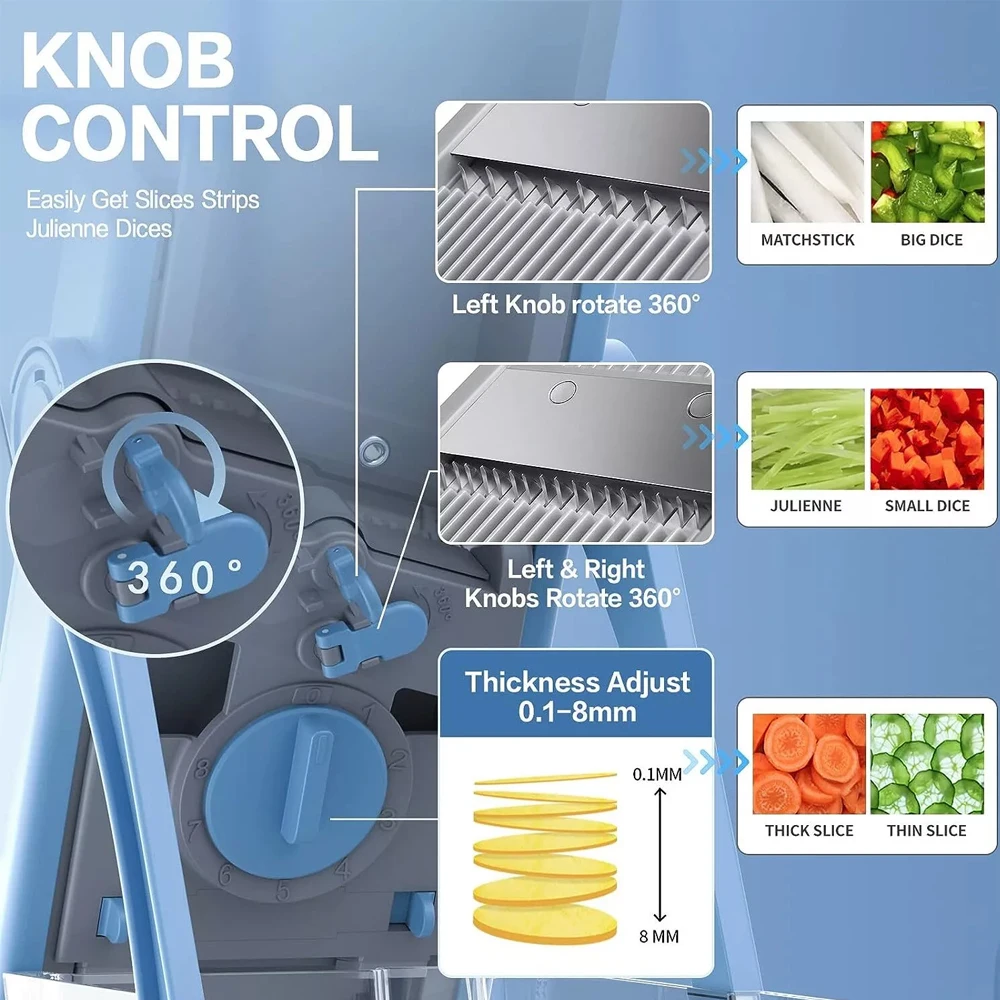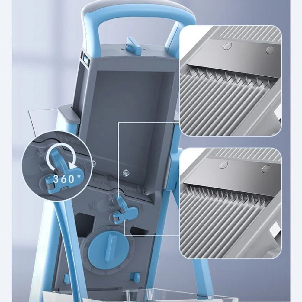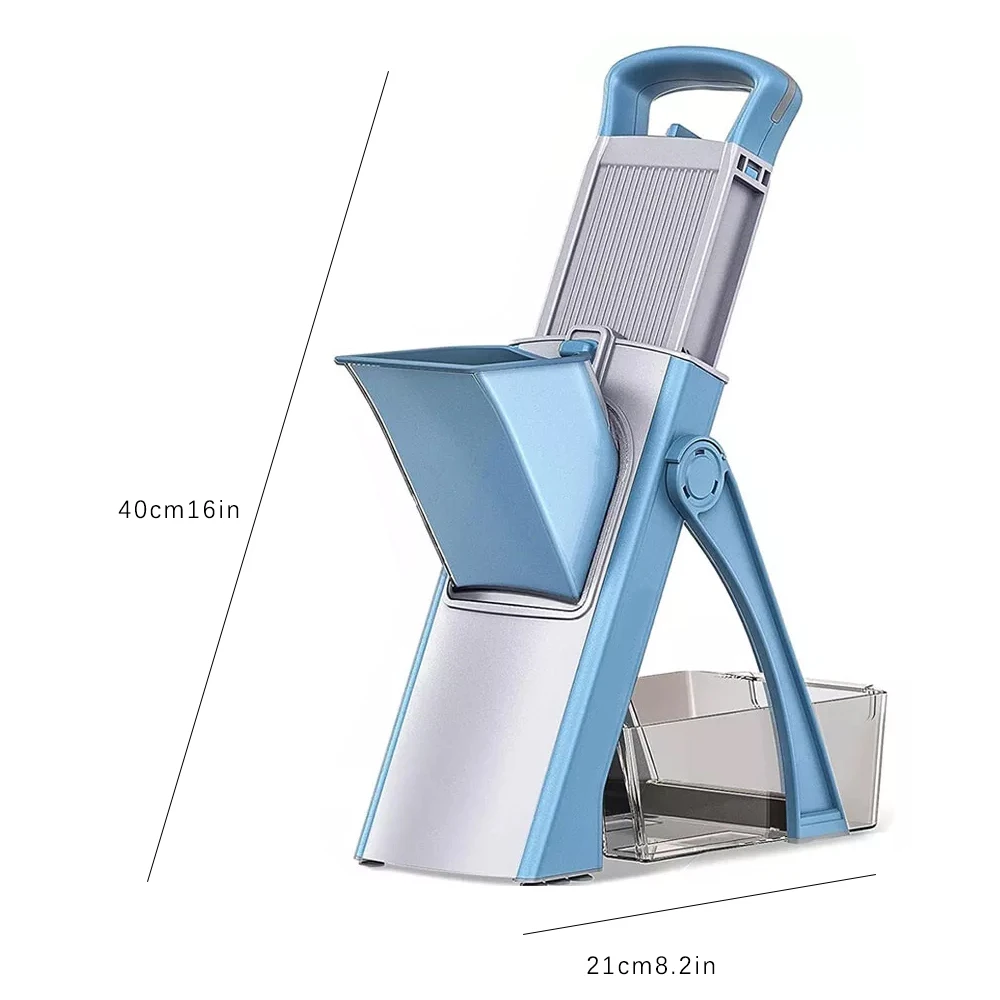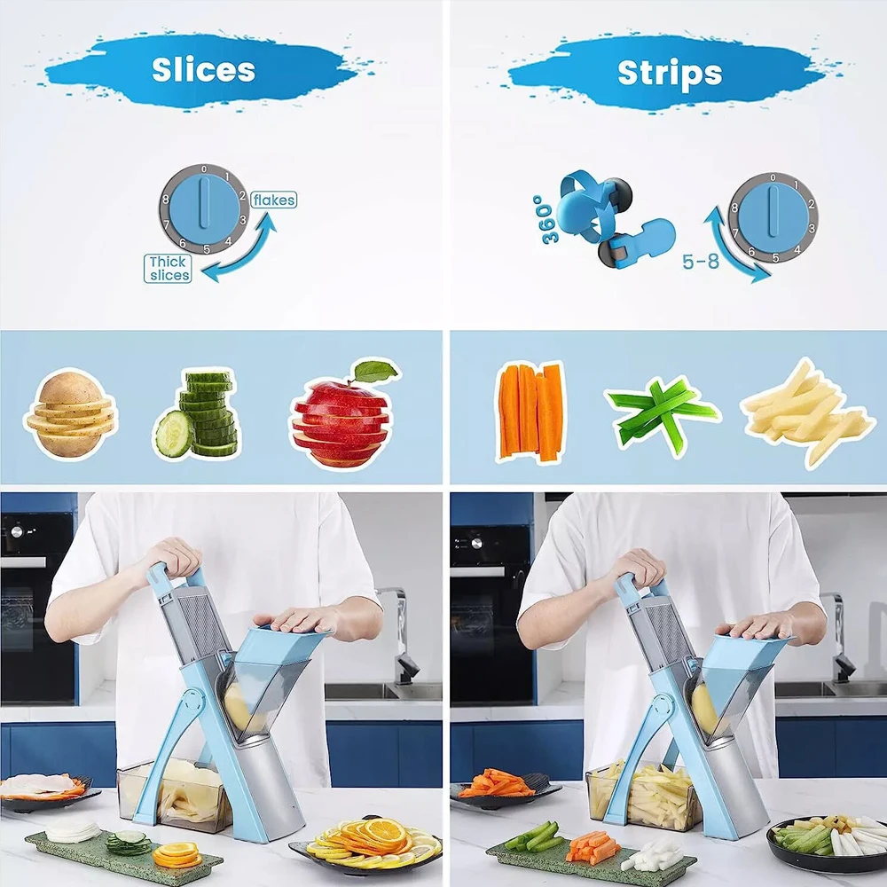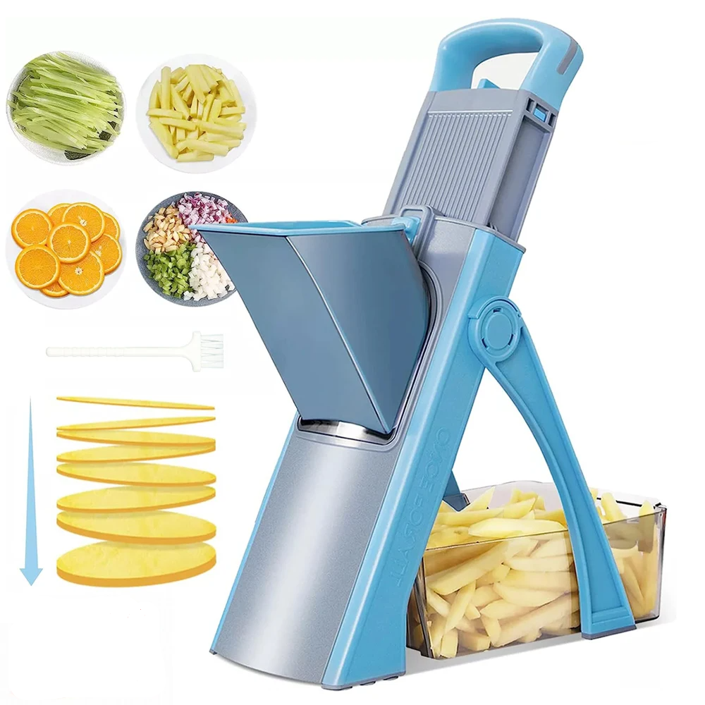 Affettatrice Mandolina Sicura, Affettatrice per Verdure, 5 in 1 Julienne di Verdure, Cubetti, Affettatrice per Frigorifero, Affettatrice da Cucina, Artefatto, Tritatutto Verticale per Frutta e VerduraCaratteristiche:【Proteggi le tue mani!】- Taglierina sicura per mandolino- Non è più necessario sostituire più bla/des!Il design integrato bla/de elimina il rischio di contatto con le lame, rendendo superflui i guanti di sicurezza.Ci sono ventose ai piedi del prodotto che permettono alla mandolina di rimanere saldamente in posizione durante l’utilizzo.【Risparmia tempo!】- Facile da usareRegola lo spessore e la distanza delle lame utilizzando la manopola rotante e i pulsanti sul retro della macchina da taglio e aziona la maniglia con un minimo sforzo.E puoi facilmente preparare verdure pretrattate come julienne di carote, fette di cetriolo, patatine fritte, cubetti di pomodoro, ecc.Questo tagliaverdure offre 4 tipi di taglio: a cubetti, a julienne, a listarelle e a strisce, con spessore delle patate regolabile da 0,1 a 8 mm.Si prega di leggere attentamente le istruzioni allegate prima dell’uso.ComodoFacile da pulire e riporre- Basta sciacquare questo tagliamandolina da cucina sotto il rubinetto dopo il taglio, utilizzare la spazzola in dotazione per pulire meglio le fessure del taglierino.Oppure puoi usare la lavastoviglie, è sicura.Questo tagliapasta può essere piegato in modo compatto, facile da riporre, occupa pochissimo spazio.【Alta qualità】- Il nostro tagliaverdure è realizzato in plastica ABS per uso alimentare, senza BPA, robusto e durevole.Lame super affilate in acciaio inossidabile temprato 420 per tagliare verdure o frutta più dure come patate dolci e barbabietole.Ciotola per alimenti di grande capacità, perfettamente aderente e stabile, ideale per raccogliere le verdure.Specifica:Materiale:Plastica + Acciaio inossidabileColore:BluContenuto della consegna:1x Strumento per Ridurre le Verdure1x pennello1x manuale utente